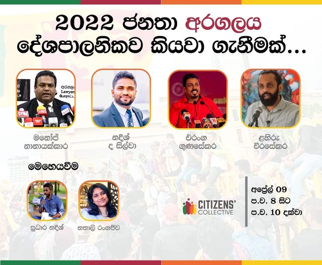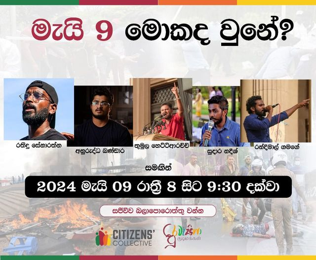 2024 මැයි 09 රාත්රී 8.00 සිට 9.30 දක්වා රතිදු සේනාරත්න තුමුල හෙට්ටිආරච්චි සුදාර නදීශ් රන්දිමාල් ගමගේ අනුරුද්ධ බණ්ඩාර Citizens' Collective සහ පුරවැසියා ඔස්සේ.