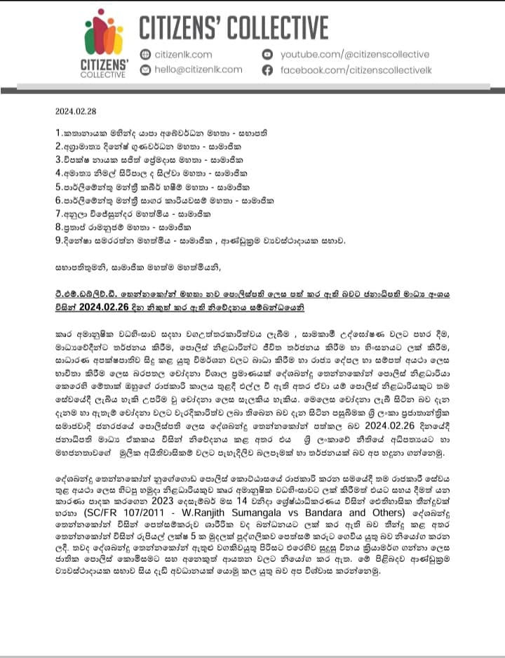 1.ටී.එම්.ඩබ්ලිව්.ඩී. තෙන්නකෝන් මහතා කිසිදු ලෙසකින් පොලිස්පති ධූරයට නොසුදුසු බව 2.පොලිස්පති ධූරයට