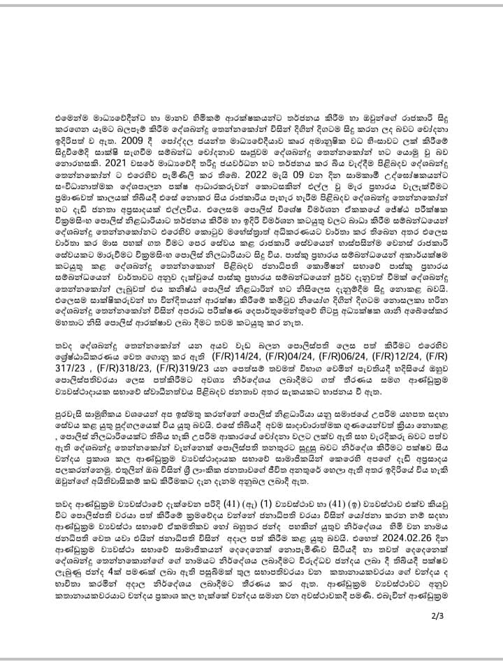 තවද ආණ්ඩුක්රම ව්යවස්ථාවේ දැක්වෙන පරිදි (41) (ඇ) (1) ව්යවස්ථාව හා (41) (ඉ) ව්යවස්ථාව එක්ව කියවු විට පොලිස්පති වරයා පත් කිරීමේ ක්රමවේදය වන්නේ ජනාධිපති වරයා විසින් යෝජනා කරන නම් සදහා ආණ්ඩුක්රම ව්යවස්ථා සභාවේ ඒකමතිකව හෝ බහුතර ජන්ද පහකින් යුතුව නිර්දේශය හිමි වන නාමය ජනධිපති වෙත යවා එයින් ජනාධිපති විසින් අදාල පත් කිරීම කළ යුතු බවයි. එහෙත් 2024.02.26 දින ආණ්ඩුක්රම ව්යවස්ථා සභාවේ සාමාජිකයන් දෙදෙනෙක් නොපැමිණිව සිටියදී හා තවත් දෙදෙනෙක් දේශබන්දු තෙන්නකොන්ගේ ගේ නාමයට නිර්දේශය ලබාදීමට විරුද්ධව ජන්දය ලබා දී තිබියදී පක්ෂව ලැබුණු ජන්ද 4ක් පමණක් ලබා ඇති පසුබිමක් තුල සභාපතිවරයා වන කතානායකවරයා ගේ චන්දය ද භාවිතා කරමින් අදාල නිර්දේශය ලබාදීමට තීරණය කර ඇත. ආණ්ඩුක්රම ව්යවස්ථාවට අනුව කතානායකවරයාට චන්දය ප්රකාශ කල හැක්කේ චන්දය සමාන වන අවස්ථාවකදී පමණි. එබැවින් ආණ්ඩුක්රම ව්යවස්ථාදායක සභාවේ සභාපතිවරයා ආණ්ඩුක්රම ව්යවස්ථාවට අනනුකූල ලෙස ක්රියාකර ඇති බව අප තරයේ ප්රකාශ කර සිටින්නෙමු.ආණ්ඩුක්රම ව්යවස්තාදායක සභාවේ සභාපතිවරයා වන කතානායක මහින්ද යාපා අබේවර්ධන විසින් මෙහිදී කතානායකධූරය කෙරෙහි ශ්රි ලංකා ජනතාව තුළ ඇති විශ්වාසය හිතාමතා පළුදු කර ඇත.