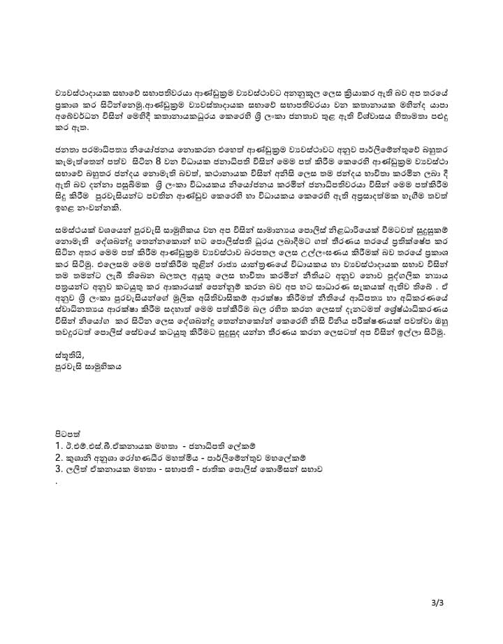 දක්වමින් පුරවැසි සාමූහිකය විසින් ව්යවස්ථාදායක සභාව , පාර්ලිමේන්තු ලේකම්වරයා, ජනාධිපතිවරයා සහ ජාතික පොලිස් කොමිසම වෙත යොමු කරන ලද ලිපිය.