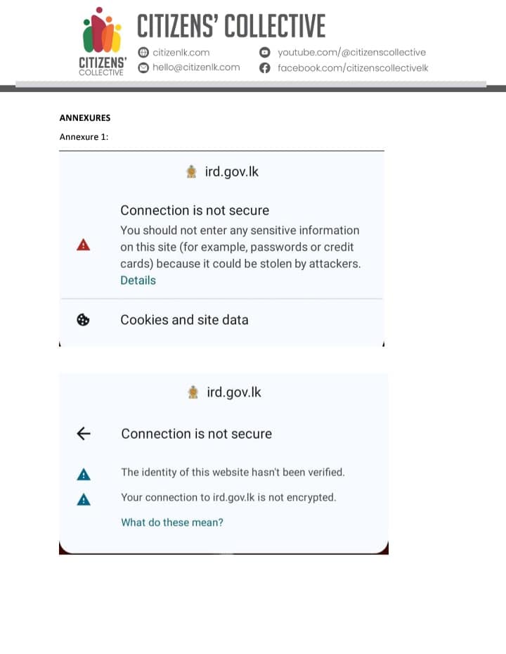 25 May Statements දේශීය ආදායම් බදු දෙපාර්තමේන්තුවේ නිළ වෙබ් අඩවියෙහි දත්ත වල සුරක්ෂිතතාවය සහතික කිරීම දේශීය ආදායම් බදු දෙපාර්තමේන්තුවේ නිළ වෙබ් අඩවියෙහි දත්ත වල සුරක්ෂිතතාවය සහතික කිරීම පිළිබදව ගැටළු සහගත තත්වයක්… දේශීය ආදායම් බදු දෙපාර්තමේන්තුවේ නිළ වෙබ් අඩවිය වන www.ird.gov.lk වෙබ් අඩවිය සදහා SSL Certificate (Secure Sockets Layer සහතිකකරණය) ලබාගෙන නොමැති බව අප හට නිරීක්ෂණය වී ඇත. මහජනතාවගේ ඉතා වැදගත් දත්ත සමග ගනුදෙනු කරන වෙබ් අඩවියක් බැවින් උපරිම ආරක්ෂණ ක්රමවේද අනුගමනය කිරීම අත්යවශ්ය බව අපි විශ්වාස කරන්නෙමු. මේ පිළිබදව අවශ්ය ක්රියාමාර්ග ගන්නා ලෙස දන්වමින් දේශීය ආදායම් බදු කොමසාරිස් වරයාට Citizens’ Collective විසින් අද දින යොමු කරන ලද ලිපිය පහත පරිදි වේ. #CitizensCollective#CC 0 Comments Like